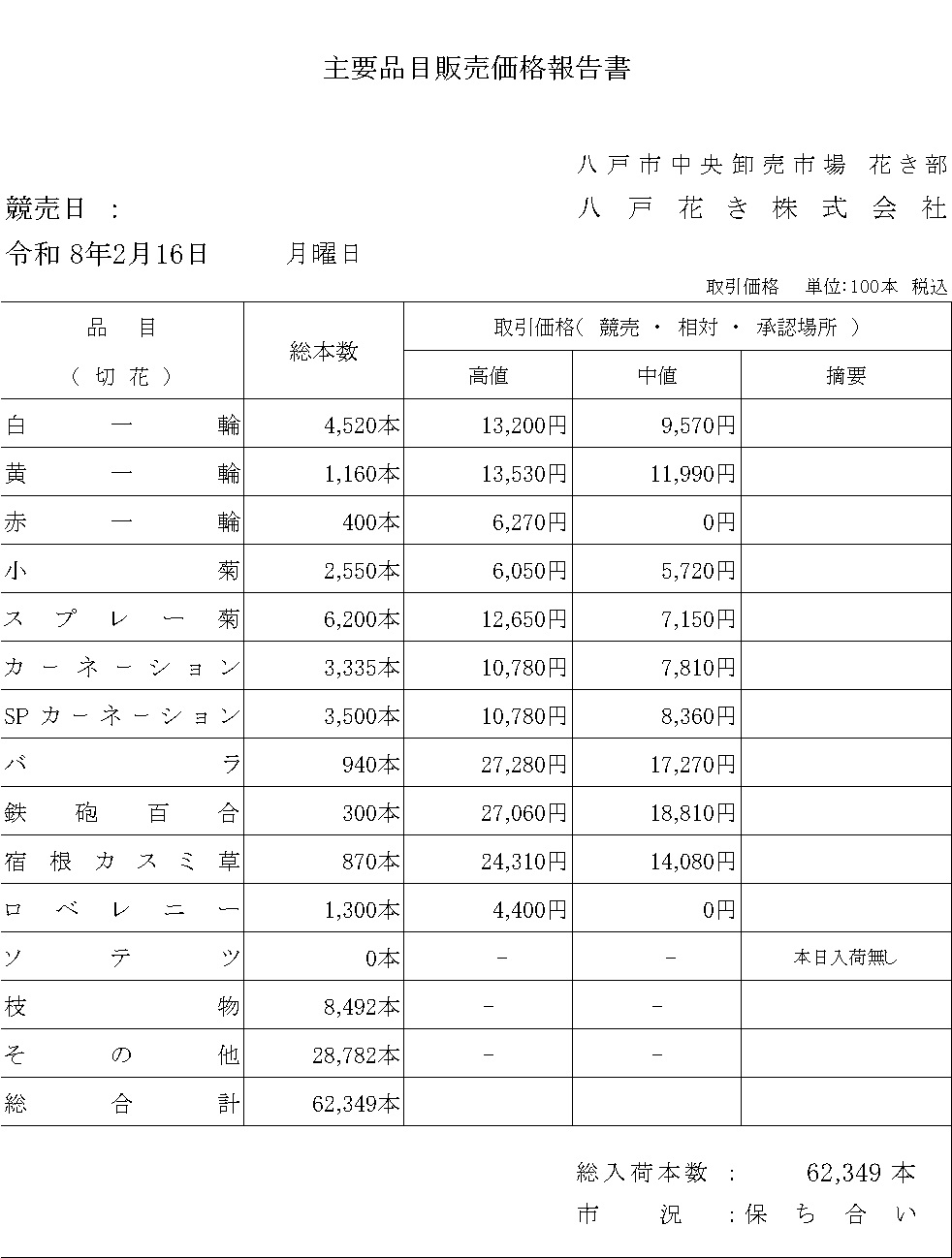 本日の市況-切り花